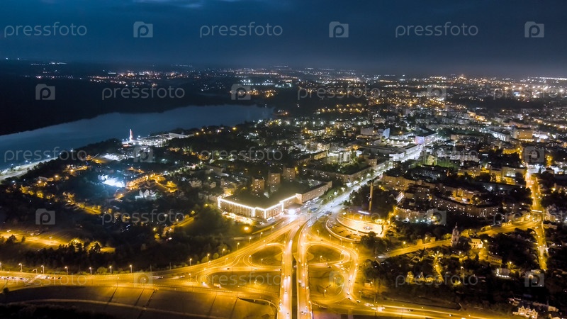 Калуга, Россия.Вход в центр города через переулок Калуги Гагарина и мост Гагарина.Ночные огни, вид с воздуха