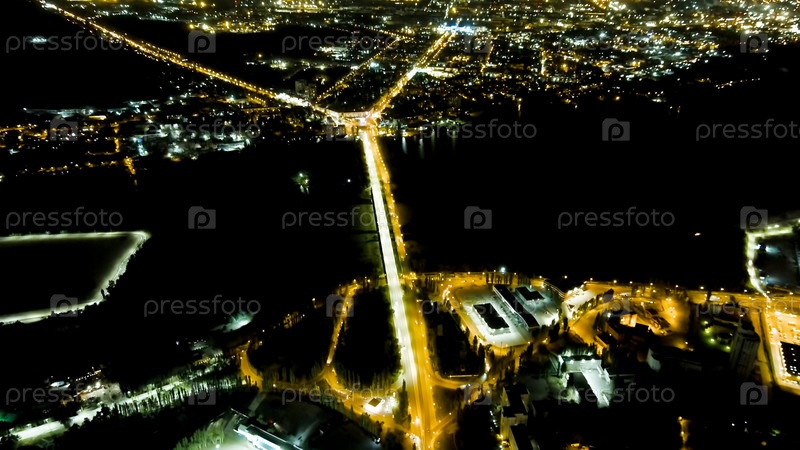 Липецк, Россия. Петровский мост. Городские огни ночью. Полет после захода солнца. Левый берег, вид с воздуха