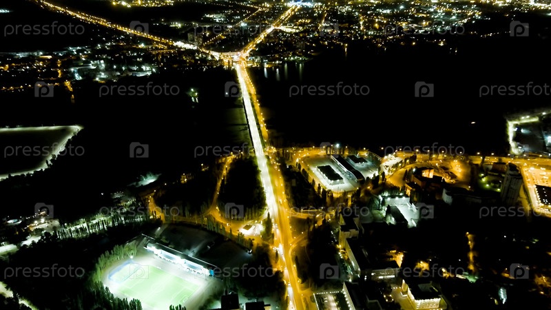 Липецк, Россия. Петровский мост. Городские огни ночью. Полет после захода солнца. Левый берег, вид с воздуха