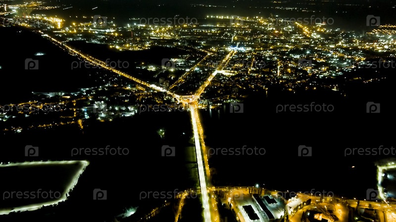 Липецк, Россия. Петровский мост. Городские огни ночью. Полет после захода солнца. Левый берег, вид с воздуха