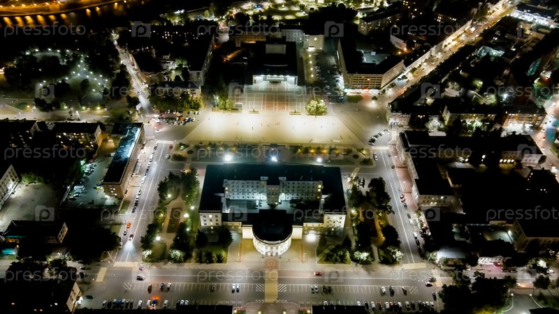 Орёл, Россия. Правительство Орельской области. Площадь Ленина. Исторический центр. Вид из воздуха на город. Ночной полет, Aerial View