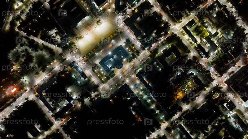 Орёл, Россия. Правительство Орельской области. Площадь Ленина. Исторический центр. Вид на город из воздуха. Ночной полет, вид с воздуха, головной выстрел