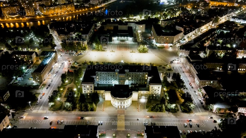 Орёл, Россия. Правительство Орельской области. Площадь Ленина. Исторический центр. Вид из воздуха на город. Ночной полет, Aerial View