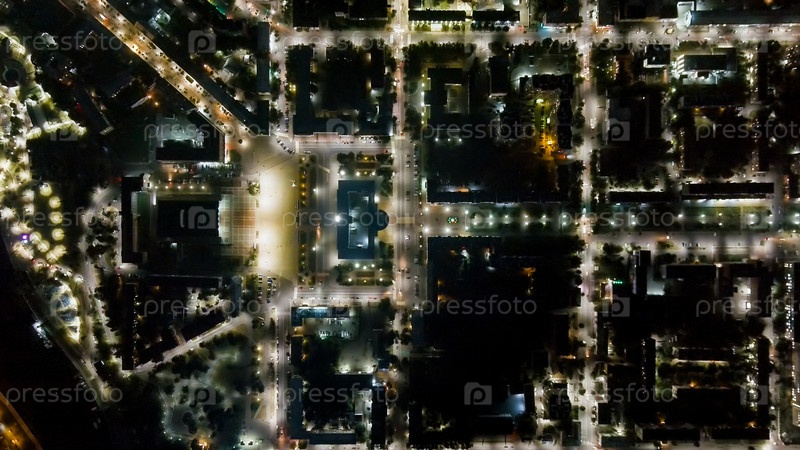 Орёл, Россия. Правительство Орельской области. Площадь Ленина. Исторический центр. Вид на город из воздуха. Ночной полет, вид с воздуха, головной выстрел