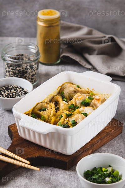 Пищевые пельмени с травами и соусом в панели на столе вертикальный вид
