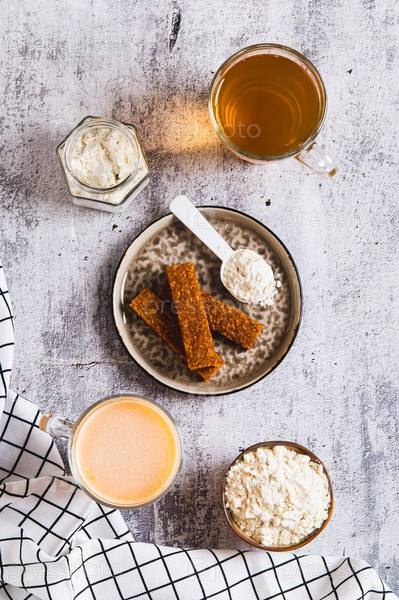 Белковое питание и зеленый чай для ухода за микробиомом кожи установлены на столешнице с вертикальным обзором