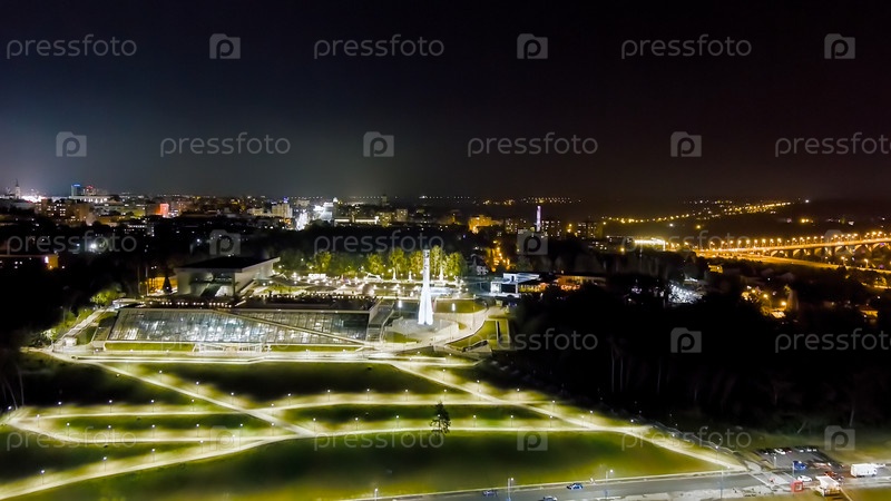 Калуга, Россия. Яченская набережная. Космическая ракета. Ночной полет над городом, вид с воздуха