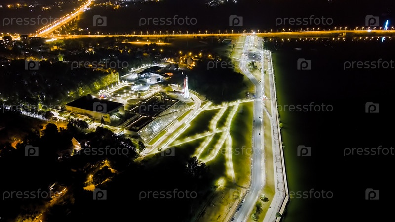 Калуга, Россия. Яченская набережная. Космическая ракета. Ночной полет над городом, вид с воздуха