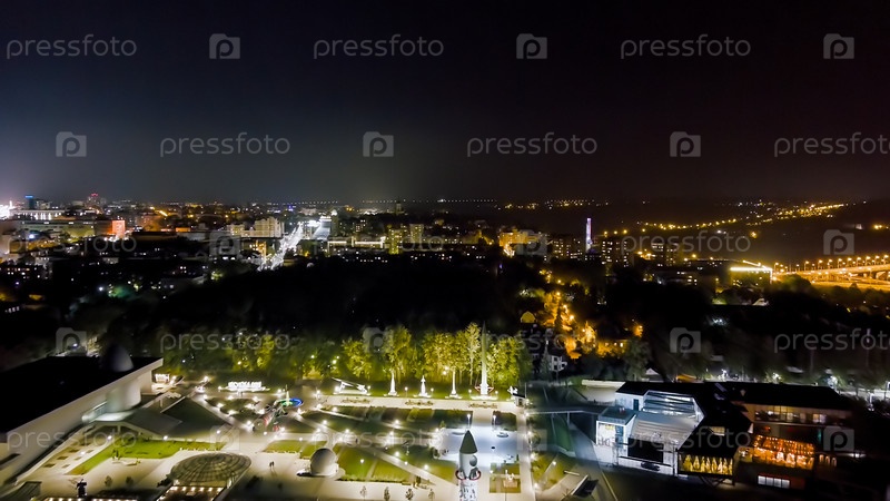 Калуга, Россия. Яченская набережная. Космическая ракета. Ночной полет над городом, вид с воздуха