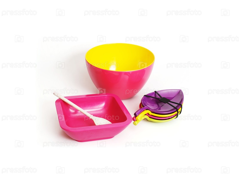 Набор ярких пластиковых блюд изолирован на белом фоне