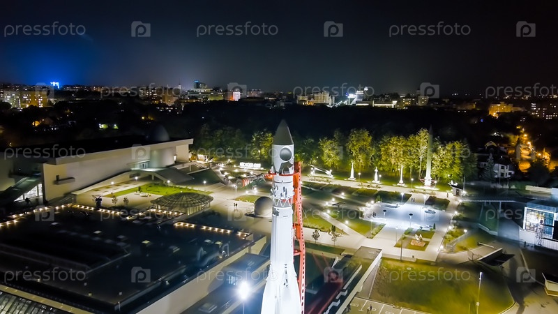 Калуга, Россия. Яченская набережная. Космическая ракета. Ночной полет над городом, вид с воздуха