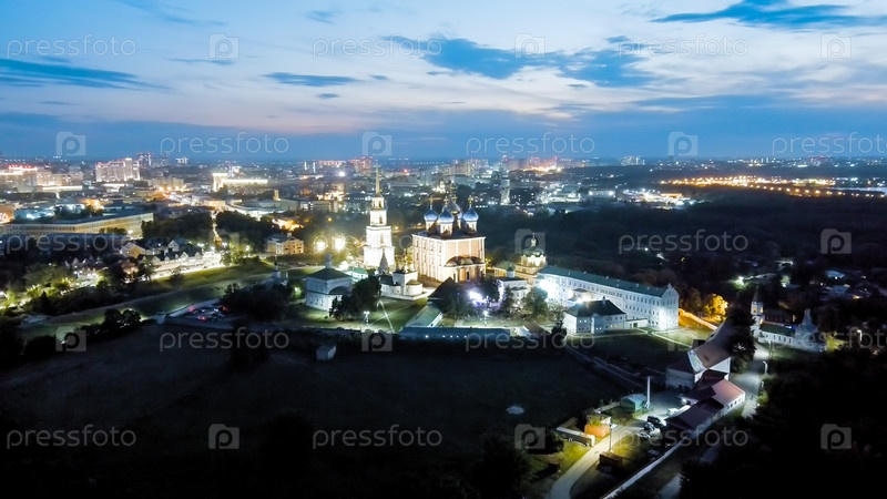 Рязань, Россия.Ночной рейс.Рязанский Кремль - самая старая часть города Рязани.Кафедральный собор Успения Пресвятой Девы Марии, вид с воздуха