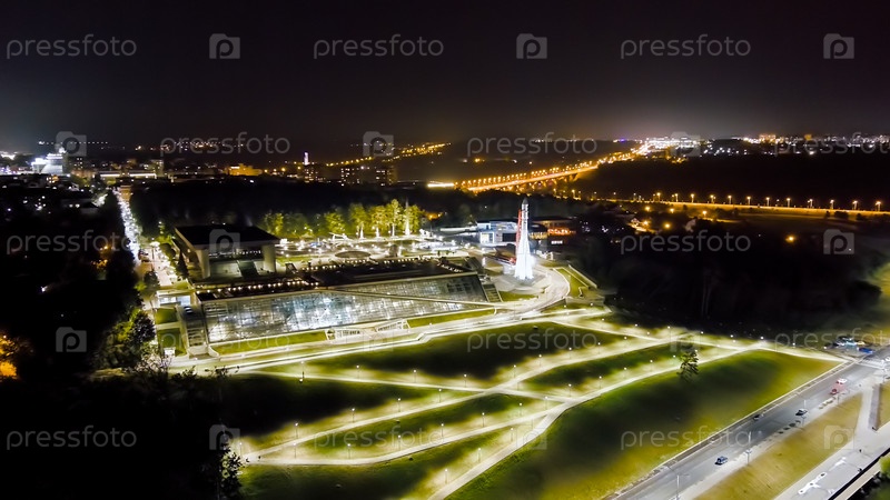 Калуга, Россия. Яченская набережная. Космическая ракета. Ночной полет над городом, вид с воздуха