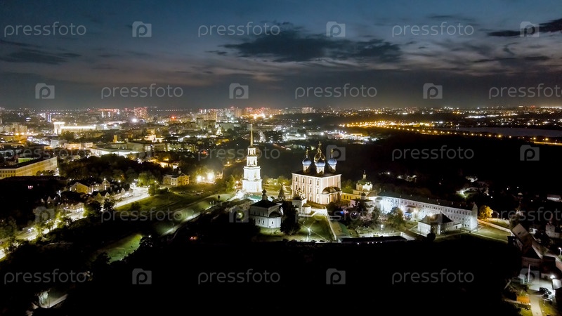 Рязань, Россия.Ночной рейс.Рязанский Кремль - самая старая часть города Рязани.Кафедральный собор Успения Пресвятой Девы Марии, вид с воздуха