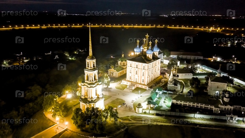 Рязань, Россия.Ночной рейс.Рязанский Кремль - самая старая часть города Рязани.Кафедральный собор Успения Пресвятой Девы Марии, вид с воздуха