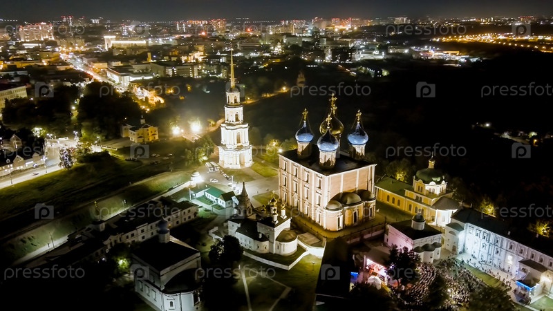 Рязань, Россия.Ночной рейс.Рязанский Кремль - самая старая часть города Рязани.Кафедральный собор Успения Пресвятой Девы Марии, вид с воздуха