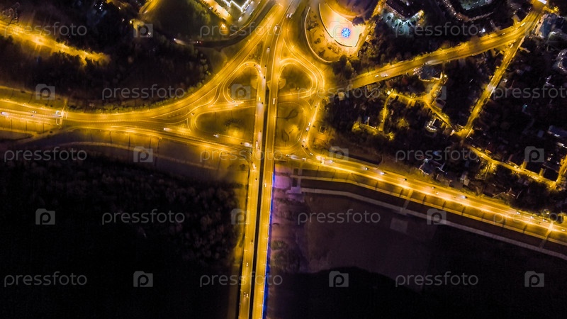 Калуга, Россия.Вход в центр города на перекрестке Калуги Гагарина.Ночное освещение, вид с воздуха, головной удар