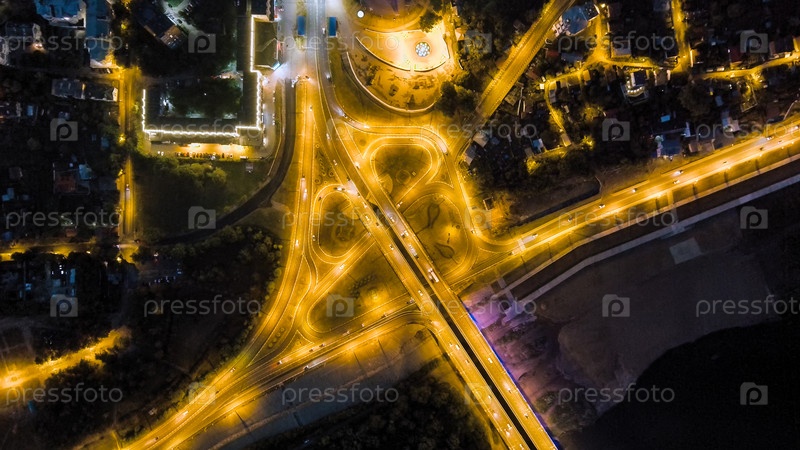 Калуга, Россия.Вход в центр города на переходе Калуги Гагарина.Ночные огни, вид с воздуха