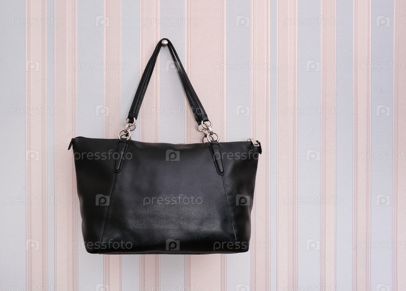 Элегантная черная сумка с золотым замком, изолированная на полосатом фоне
