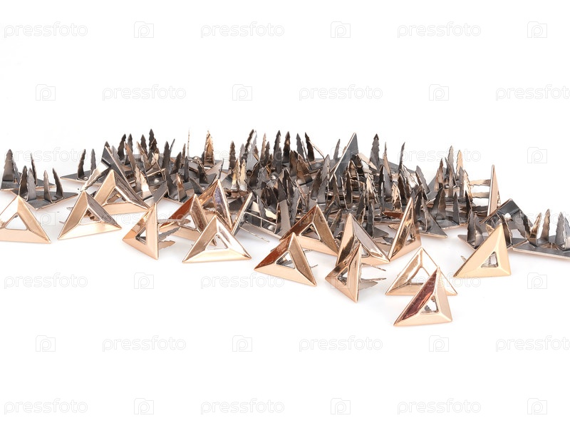 Куча золотых треугольных нитов для украшения одежды и аксессуаров, изолированных на белом фоне