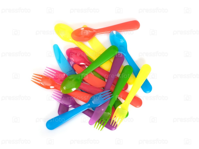 Пикник с пластиковыми ложками, вилками и ножами, изолированными на белом фоне