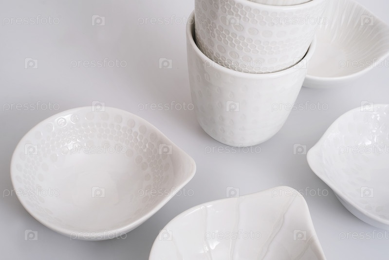 Набор чашек и тарелок для напитков, изолированных на белом фоне