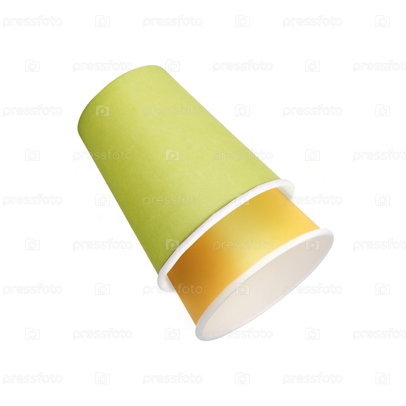 Скульптура желтой бумажной чашки изолирована на белом фоне