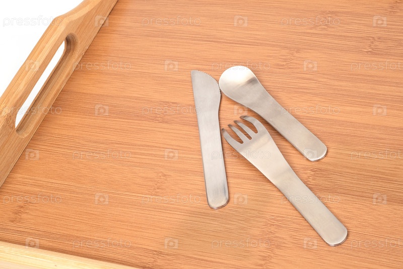 Компактный металлический нож, ложка и вилка на бамбуковой подносе изолированы на белом фоне