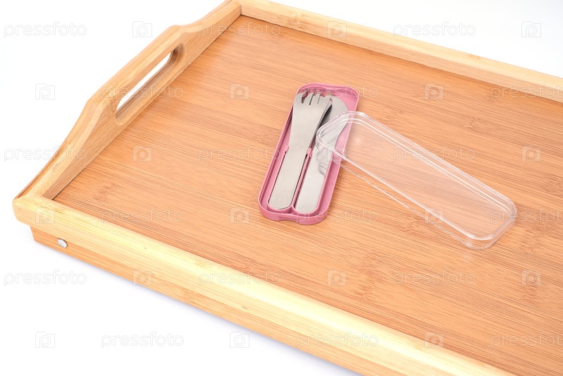 Компактный металлический нож, ложка и вилка в коробке на бамбуковом подносе, изолированном на белом фоне