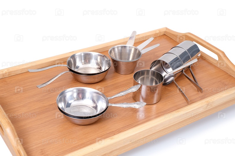 Деревянный бамбуковый поднос с металлической посудой, изолированной на белом фоне