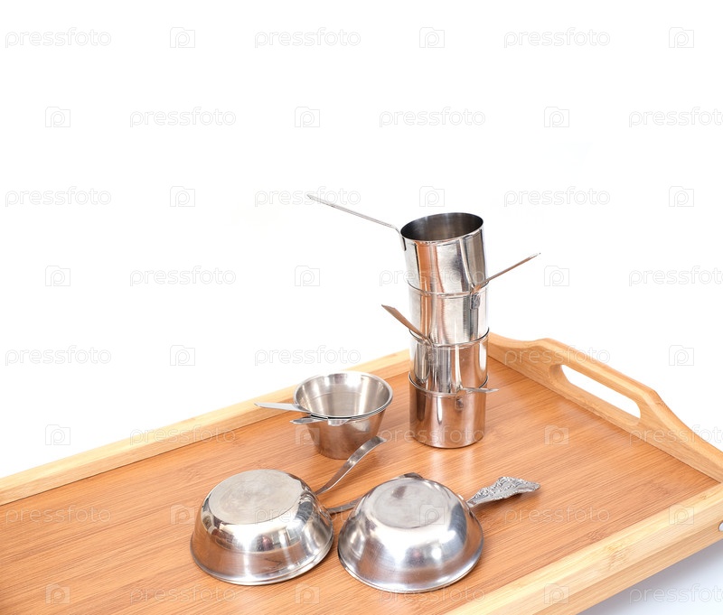 Деревянный бамбуковый поднос с металлической посудой, изолированной на белом фоне