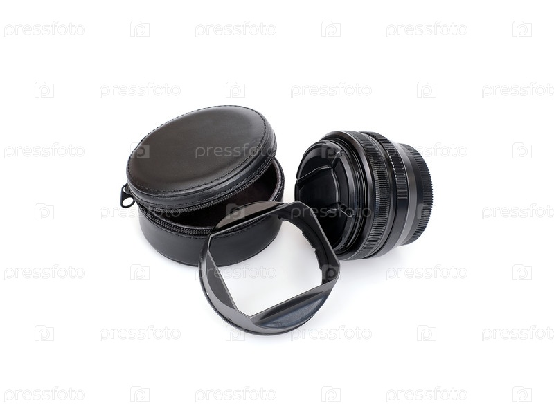 Фотообъектив и аксессуары изолированы на белом фоне