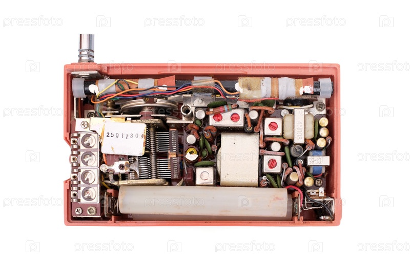 Винтажный радиоприемник, изолированный на белом фоне: вид деталей внутри