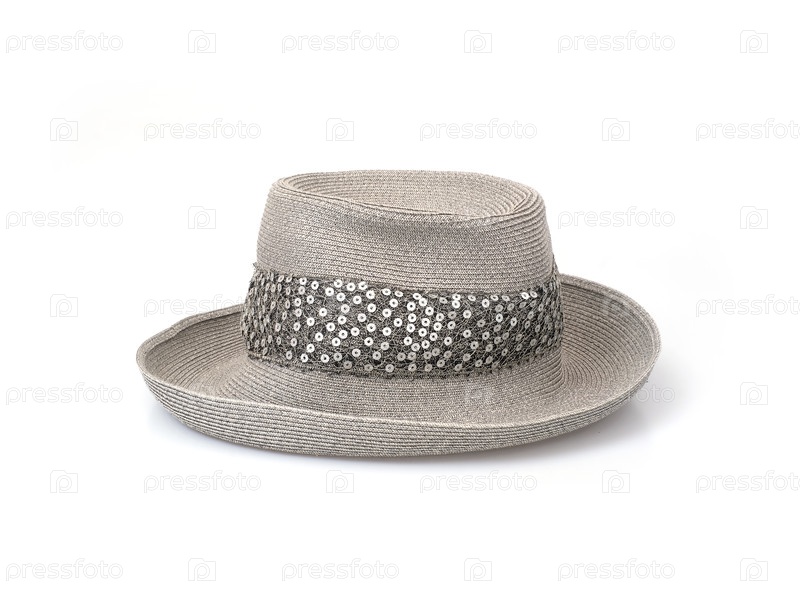 Серая соломенная женская шляпа с блестящими ленточками, изолированными на белом фоне, вырез готовый