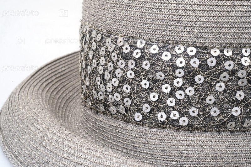 Серая женская шляпа с соломенной крышей и блестящими ленточками, изолированными на белом фоне, вырез шеи готов.Очень высокое разрешение