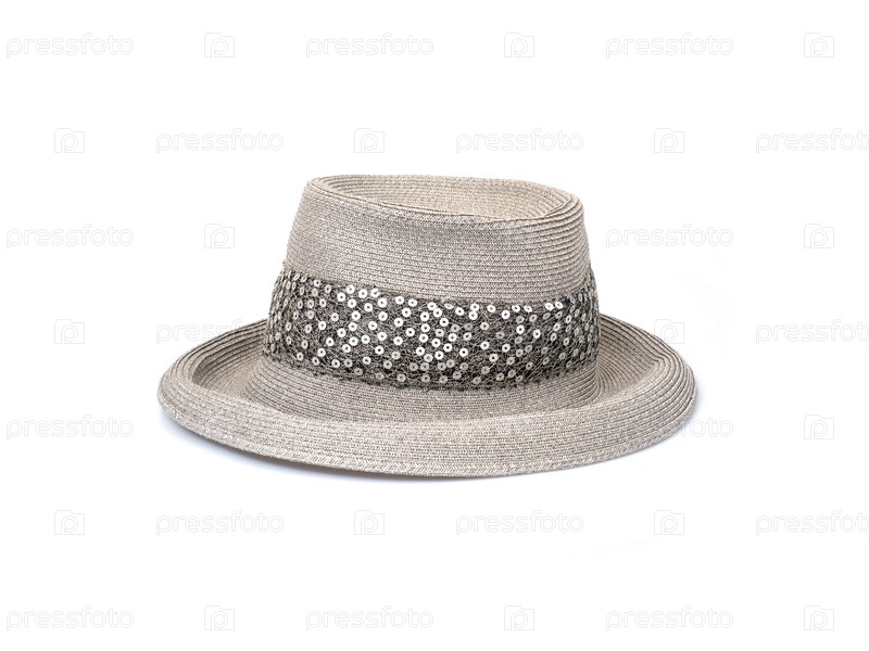 Серая соломенная женская шляпа с блестящими ленточками, изолированными на белом фоне, вырез готовый