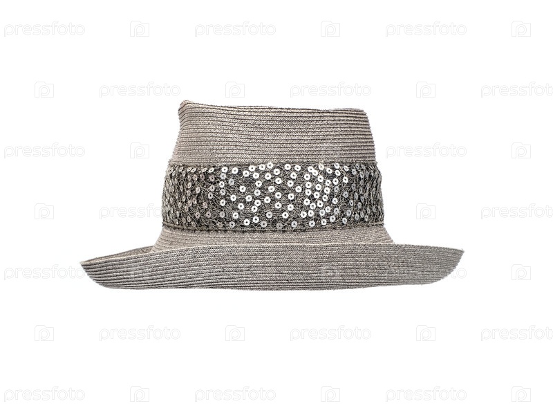 Серая соломенная женская шляпа с блестящими ленточками, изолированными на белом фоне, вырез готовый