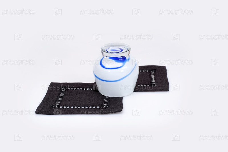 На белой поверхности находятся два небольших черных льна вышитых салфетки и маленькое круглое белое стекло