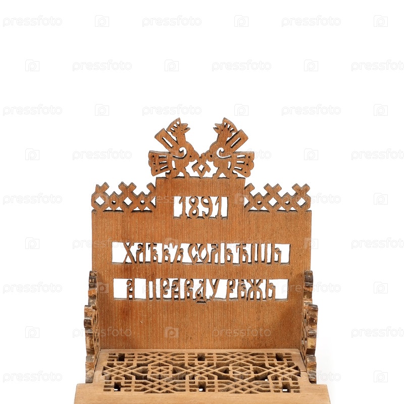 Древний резный деревянный соляной погреб (верхняя часть), изолированный на белом фоне по русской пословице