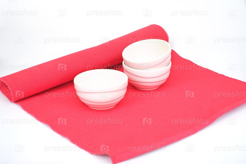 Три белых керамических салатных миски на красной салфетке, изолированной от белого фона