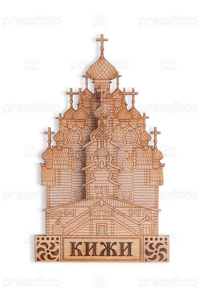 Магнитный сувенир из России. Русское название исторического места на английском языке означает 'Кижи'