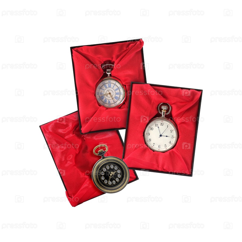 Карманные часы в красной шелковой коробке, изолированной на белом фоне