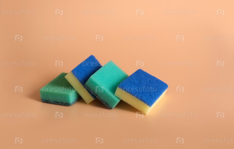 Домашние губки для домашней работы изолированы на оранжевом фоне