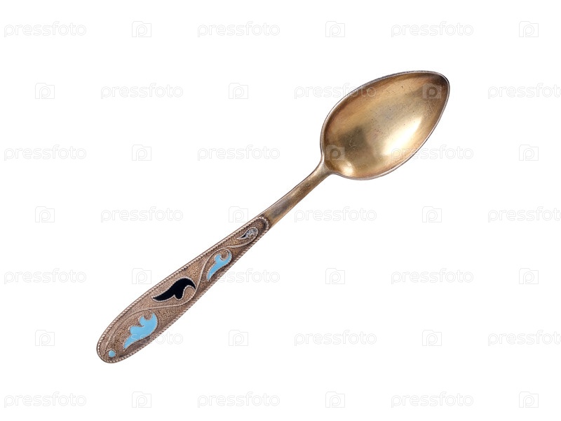 Винтажная золотая и эмалированная чайная ложка выделена на белом фоне