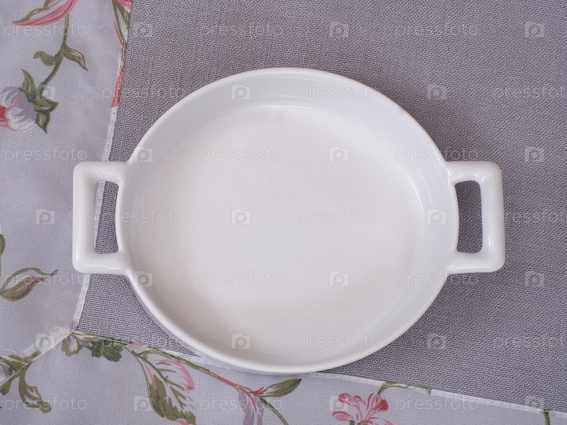 Белая керамическая тарелка для салата, супа или выпечки изолирована на красивой скатерти