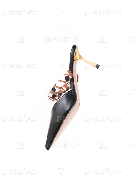Элегантные мулы из черной кожи с золотыми высокими каблуками (Stiletto heel), выделенными на белом фоне