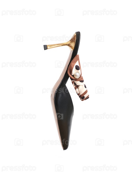 Элегантные мулы из черной кожи с золотыми высокими каблуками (Stiletto heel), выделенными на белом фоне