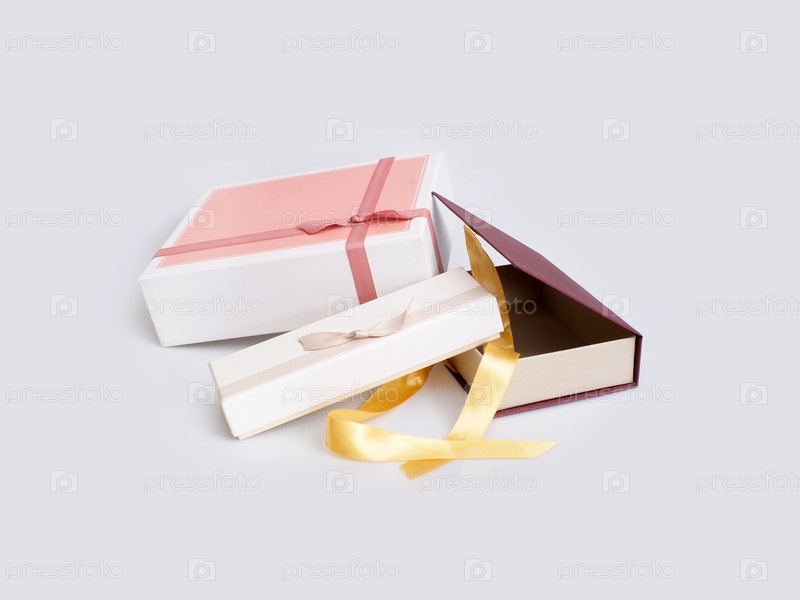 Стол подарочных коробок с луками и лентами, изолированными на белом фоне
