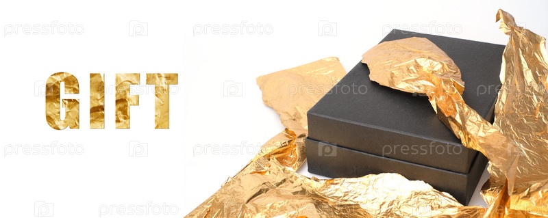 Черный подарочный ящик и золотая оберточная фольга изолированы на белом фоне