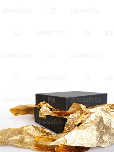 Черный подарочный ящик и золотая оберточная фольга изолированы на белом фоне